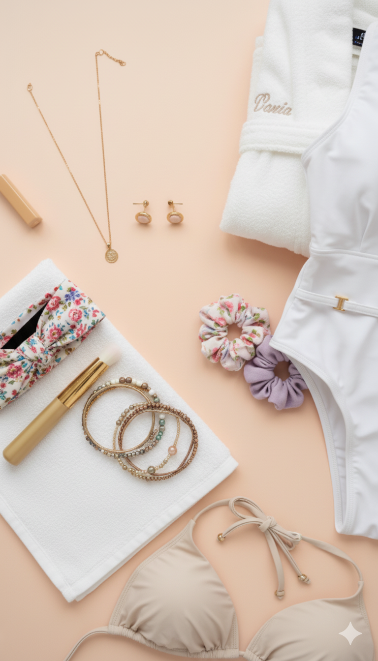 Aretes, collares, balacas, moñas, pulseras y más para resaltar tu estilo, además de ropa cómoda como batas de baño.